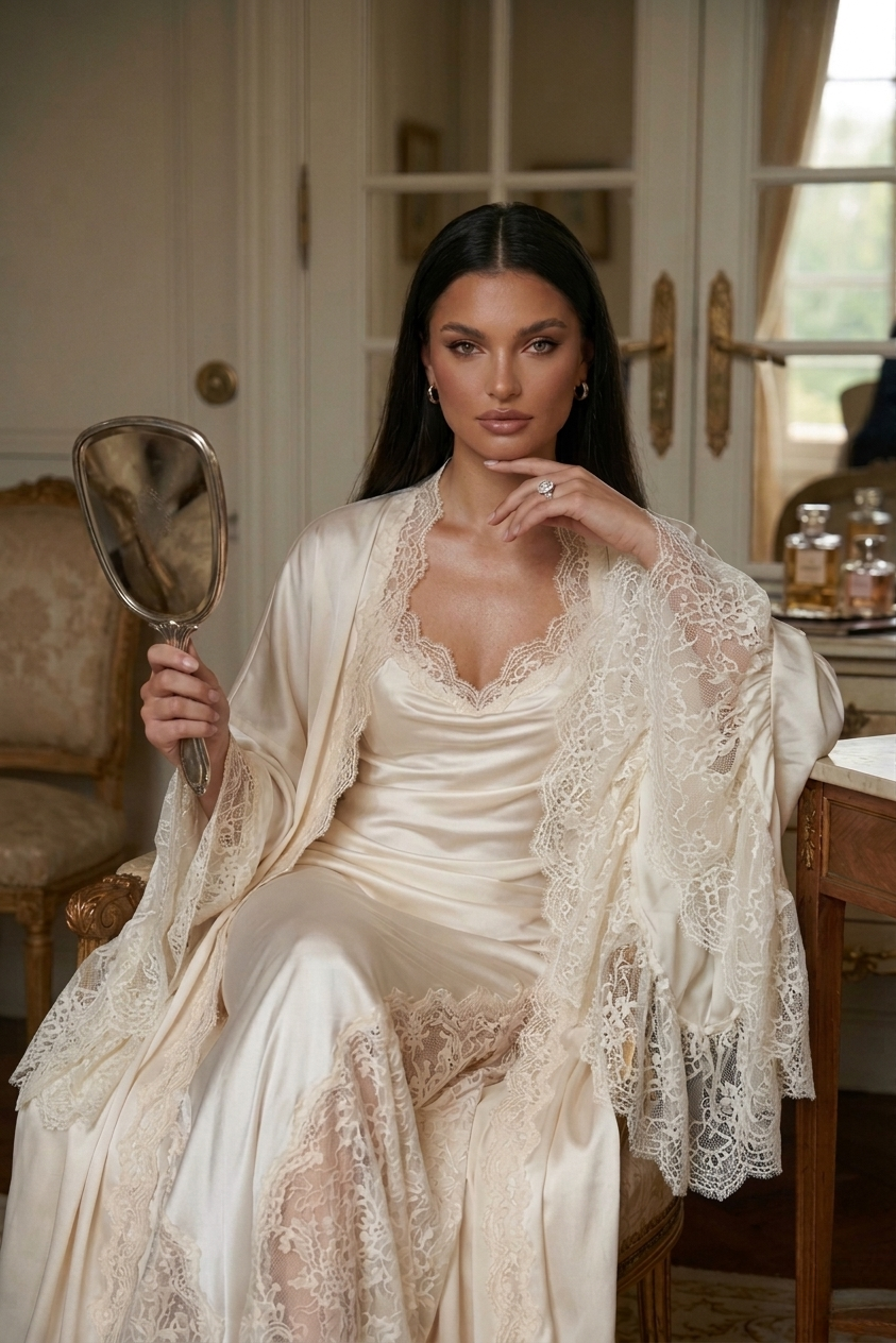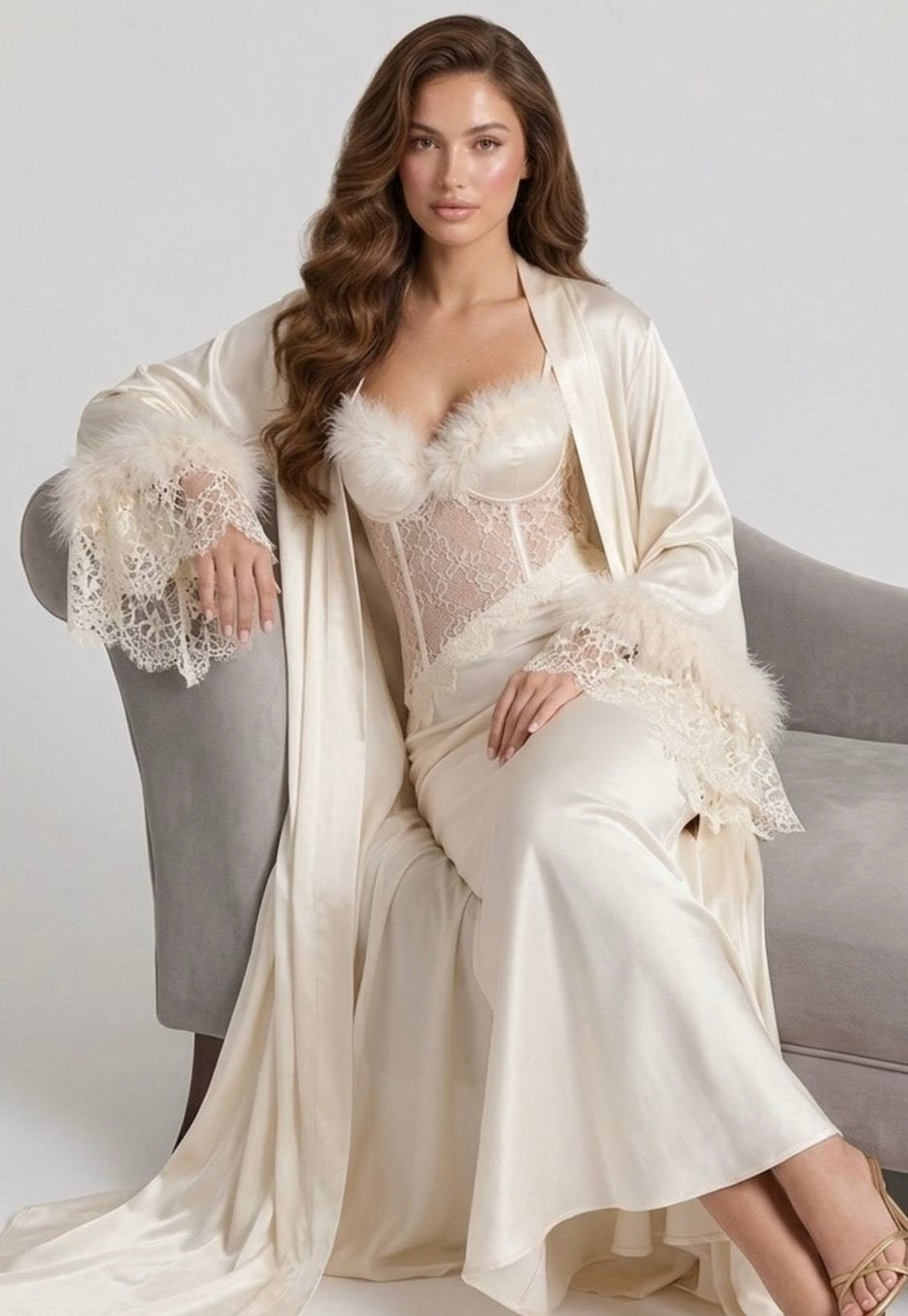 طقم عرايسي التاريخي يجمع بين والرومانسية، يتكون من فستان قصير أنيق وروب مزين بدانتيل. نقية من حرير التوت الطبيعي الصف 6A بوزن 22 موم - أجود وأغلى أنواع الحرير في العالم.