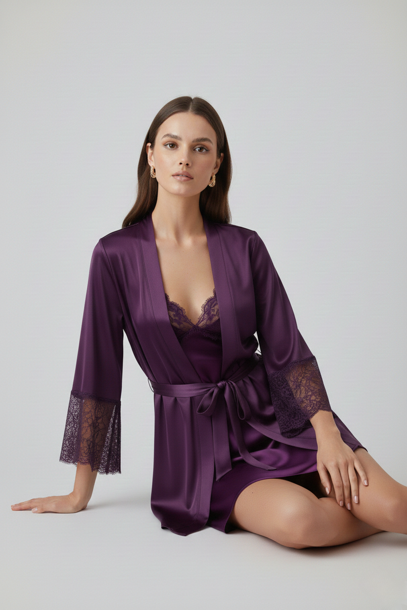 طقم روب وفستان حرير توت بدانتيل فاخر - Grade 6A | Silk Robe & Dress Set